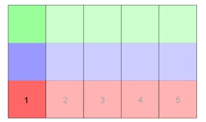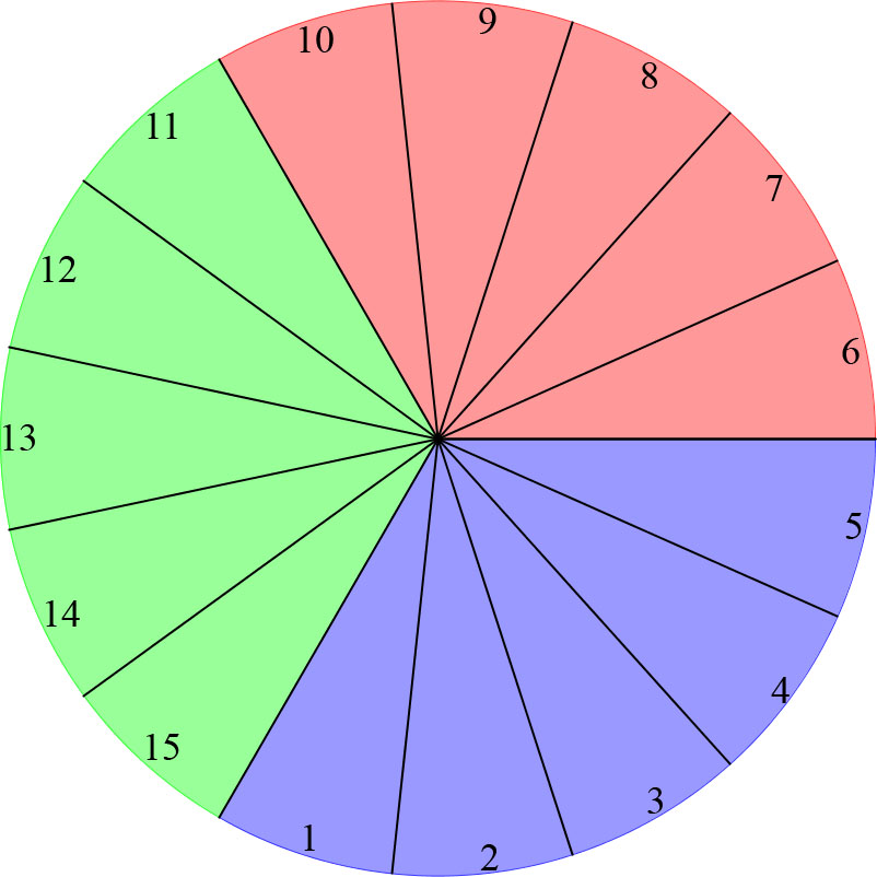 Now, divide each color (third) into five equal parts.  Looking  at the result of slicing the pizza into thirds, then each slice into fifths, the pizza has been cut into fifteen slices: three large slices (each with a different color above) were the result of the first division, then each large slice became five smaller slices as the second division was carried out, creating a total of fifteen small slices (as numbered above).  So, “a fifth of a third” will be one of the above slices, which represents one fifteenth of the original pizza: