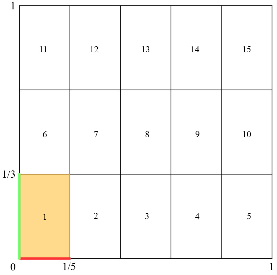 As you can see in the above illustration, the yellow rectangle is identical in size to the other 14 rectangles shown. Together, all fifteen rectangles create a 1 by 1 square, whose area is 1. The yellow rectangle, which is the product of “one third” and “one fifth”, has an area equal to one fifteenth of the square’s area, so the product of these two numbers equals one fifteenth.