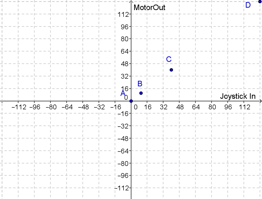 So, what kind of an equation would pass through the perfect stop (0 , 0) and full power (128 , 128) points, but get from one to the other in a more gradual way? If you trace a rough curve through points A, BModified, CModified, and D, do you recognize that shape, or at least something close to it?