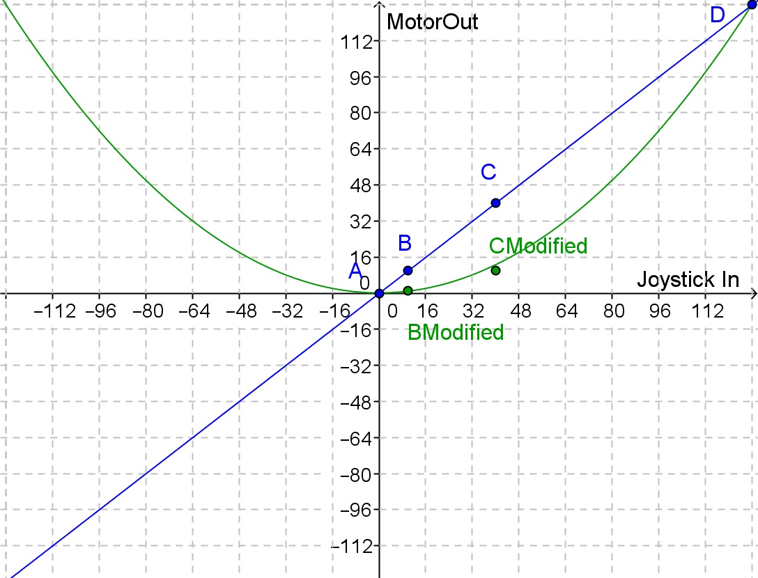 While this approach is certainly the easiest to think about and implement, once you have taken Algebra II it does not take much time or effort to dream up an improved motor control algorithm. If we plot the MotorOut values we would prefer to use for each JoystickIn value, points A and D might remain as they are above, but we might prefer the green points BModified and CModified instead of points B and C for the following reasons.